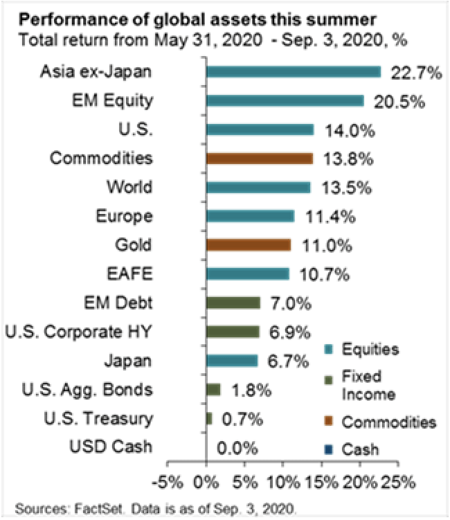 In the immediate aftermath of the announcement, there seemed to be profit-taking in some of the trades that have been working all summer (Gold, TIPS, USD), which suggests that investors have been pricing in this new, more dovish, structural stance, from the Fed. However, even though some of this change was priced in, the implications of the macroeconomic outlook and all asset classes will play out over a period of years. This gives us an unique opportunity to re-examine views across asset classes after a very good summer for investors.