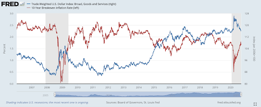 This is why the US Federal Reserve has practiced what is known as an open mouth operation. By presenting future policy strategies and giving the public forward guidance on how they expect money growth and inflation to change over the next 12-18 months. This led to their average inflation targeting, which pushed them towards their presently open-ended view of the zero lower bound for the Federal Funds Rate. Along with encouraging inflation, the Fed has adopted a new outlook on the relationship between inflation and unemployment. They will no longer react to price stability signals or fundamental labor market signals, a hallmark trait of their previous policy-making decisions. This, coupled with the fact that inflation expectations are already high due to the massive stimulus packages and quantitative easing measures, will only drive inflation higher.