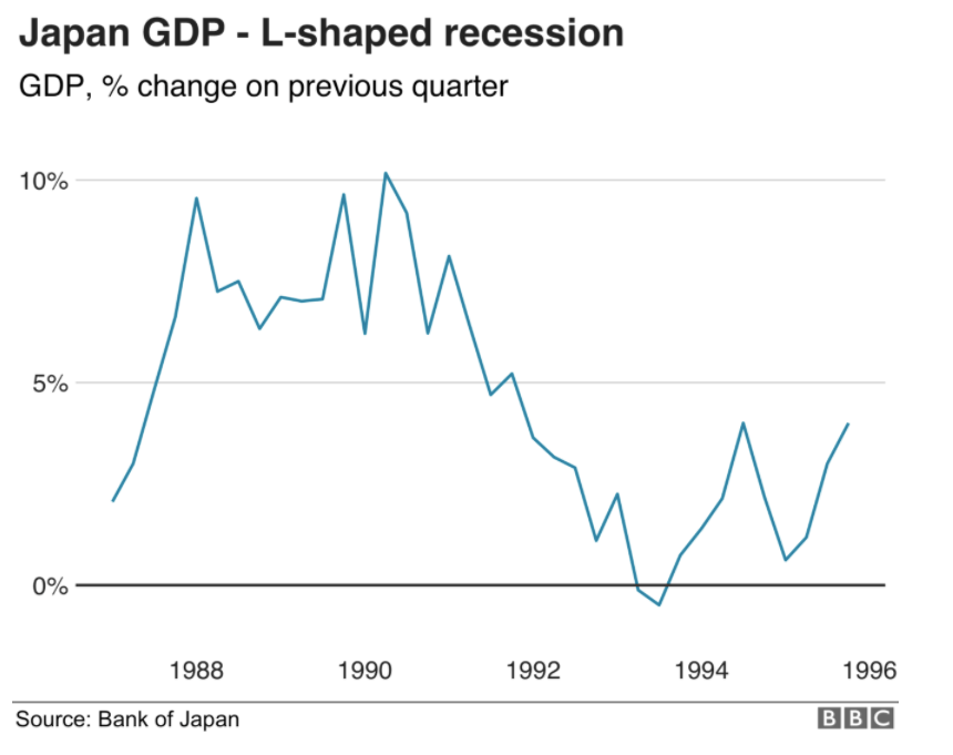Japan went through a severe L-shaped depression in the 1990s. Their massive economic growth led to over pricing assets or a ‘bubble’ which burst in the early 1990s. This was followed by a steep market crash, and a credit crunch. The government took steps in the wrong direction which caused 10 years of economic slowdown, coined as Japan’s “lost decade”.