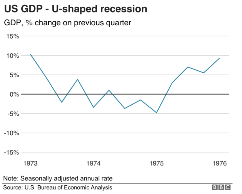 The most prominent U shaped recession curve in US history was during the 1973-75 recession. The onset of the recession was characterized by the 1973 oil crisis and increase in oil prices as well as the stock market crash of 1973-74 which resulted in high levels of unemployment and stagflation.