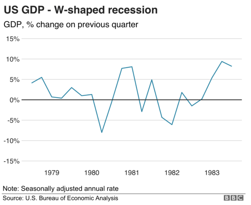The early 1980s is a textbook example of a W shaped curve. The economy weathered a second oil crisis in 1979, which caused a brief recession in 1980. Then, the US Federal Reserve increased interest rates to reduce inflation, which caused the second recession in 1981, and the economy recovered only in 1982 once the Feds aggressively cut interest rates.