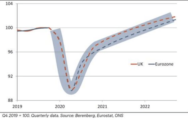 The ‘Swoosh’ recovery, inspired by the Nike logo, is an improvement on the traditional U shape. A swoosh recovery signifies a sharp decline in the GDP followed by a painfully slow recovery. It means that the depth of the economic contraction coupled with the soaring levels of unemployment makes it incredibly difficult for the economy to reach 2019 levels of output.