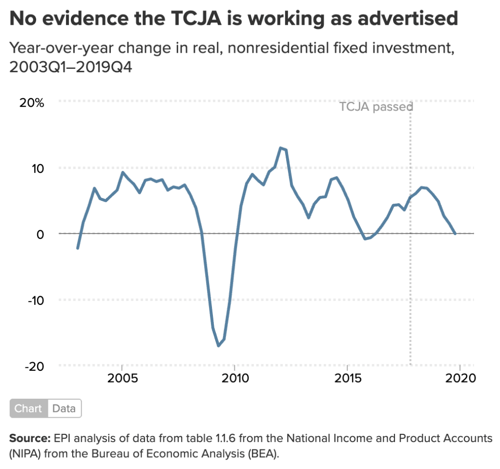 Instead, the dominant company response to the TCJA was engaging in stock buybacks (a practice that famously allows executives, bankers, and hedge funds managers to gain wealth). The first three quarters of 2018 saw a 52.6% increase in corporate stock buybacks while aggregate capital investment increased only 8.8% and R&D investment growth in US public companies increased a mere 12.5%. To make matters worse, in 2019 business investment took a sharp turn downward.