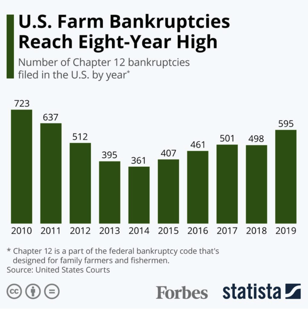 - McCarthy, Niall, (02-10-2020) “U.S. Farm Bankruptcies Reach Eight-Year High [Infographic],” Forbes Magazine. Retrieved December 1, from https://www.forbes.com/sites/niallmccarthy/2020/02/10/us-farm-bankruptcies-reach-eight-year-high-infographic/?sh=758ea81e7de0
