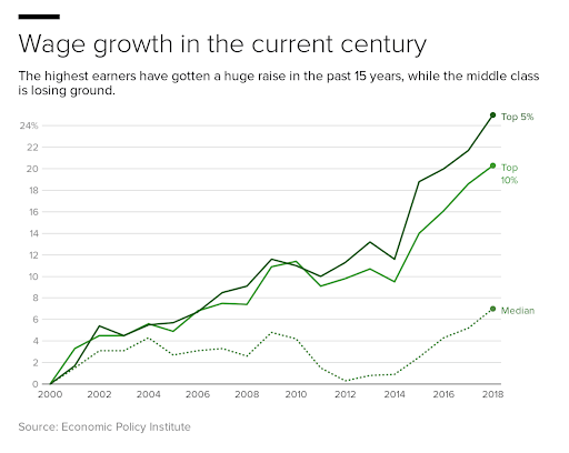 So yes – while President Trump may not be totally responsible – the current Administration has been accompanied by a substantial increase in real median annual incomes. However what proponents of the administration often overlook is the implication of income inequality. Before Trump took office, the top 5% ‘s income grew around 4x faster than middle class Incomes. The consequence of rising inequality: an increased cost of living. As society’s wealthiest compete for goods, the cost of higher education, housing, pharmaceuticals, and even stocks tend to grow faster than the average American salary. This is why studies claim though real wages during the Administration rose, they “effectively” declined as adjusted for cost of living growth, middle class affordability fell 1.3% between 2017 and 2018.