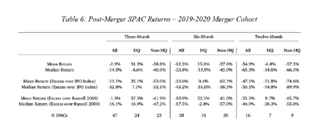 It should be noted that we have seen significant dispersion of returns from post-merger SPACs. A joint study from Stanford and NYU found that the median twelve month return of post-merger SPACs launched in 2019-June 20220 was an excess of 9.7% over the Russell 2000. However the mean return was negative 36.3%. It is critical to invest in the right SPAC and significant due diligence should be conducted.