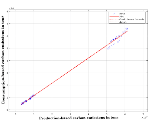 A regression model is devised in MATLAB to test the correlation between the production and consumption-based carbon emissions (in tons) for the sampled countries. The dataset ranges over thirty years (1990-2019) and comprises 120 data points.