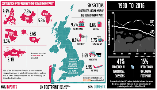 Studying the United Kingdom’s carbon footprint profiling between 1997-2018 reveals that carbon consumption-based emissions have consistently remained higher than territorial emissions. This is most likely due to a sectoral shift in the economy that has made the service sector the most important economic sector and thus, has prompted the outsourcing of the secondary sector commodities. These commodities, often imported from countries with lax climate regulations, end up bringing in higher carbon-emissions into its consumption figures.