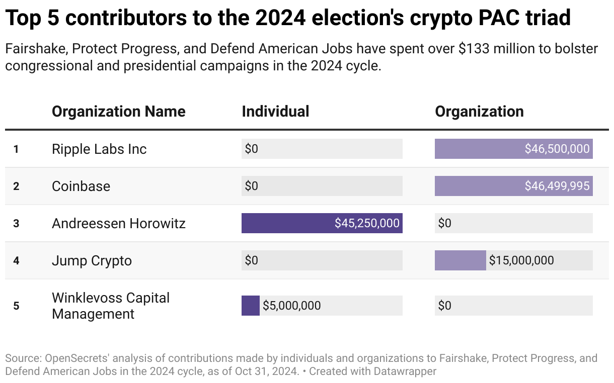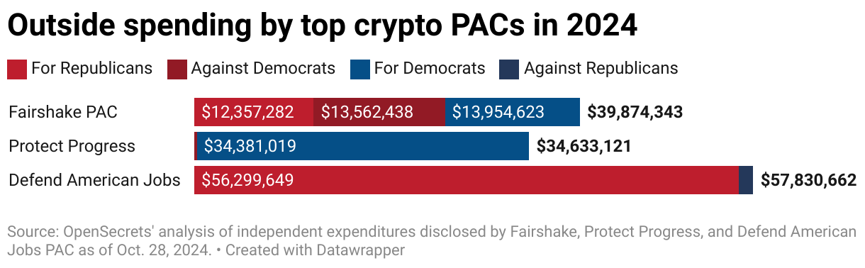 This influence extended to both federal and state levels leading up to Election Day. In December 2023, three super PACs backed by prominent crypto figures announced plans to invest $78 million to support candidates favorable to the industry. Fairshake alone raised over $200 million through major donations from stakeholders such as the Winklevoss twins, Kraken, Coinbase and Electric Capital Partners. The group reportedly spent $10 million on attack ads targeting Representative Katie Porter in California’s Senate race, which she ultimately lost. Similarly, the Cedar Innovation Foundation, another super PAC with undisclosed backers, worked to unseat Senate Banking Chairman Sherrod Brown in early 2024.