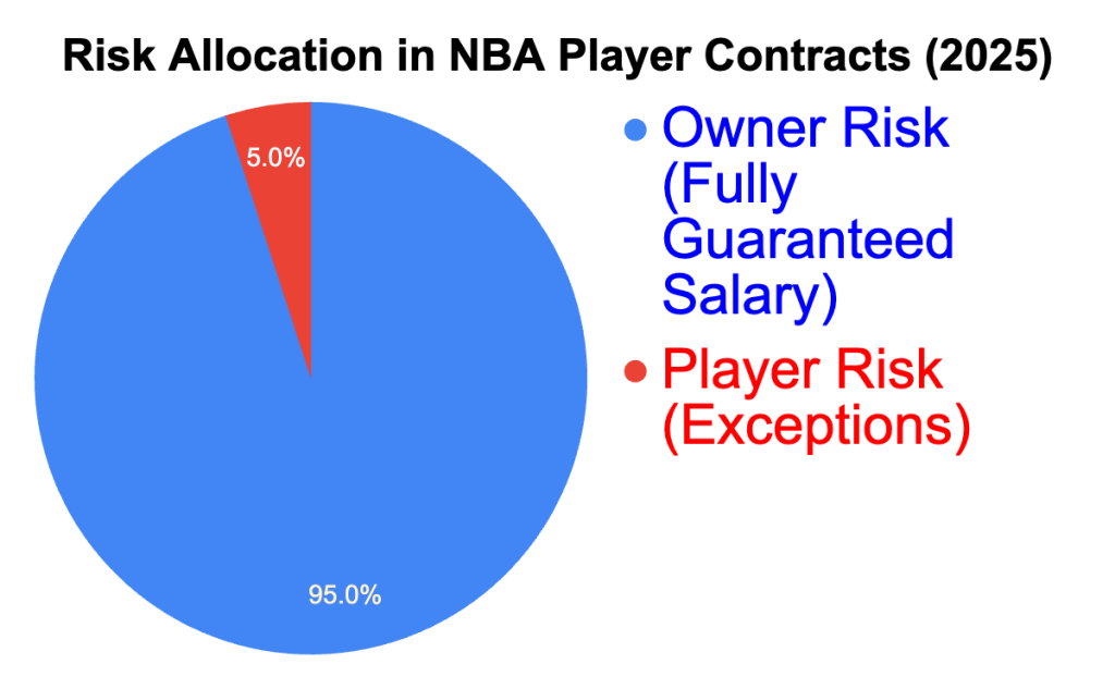 Figure 4: Unlike in the NFL however, NBA contracts are generally fully guaranteed, requiring teams to pay out the full contract amount even if a player is released. This places nearly all financial risk on owners, with players facing minimal contractual downside once a deal is signed, with a 5-10% portion excluded after malus/clawback deductions.