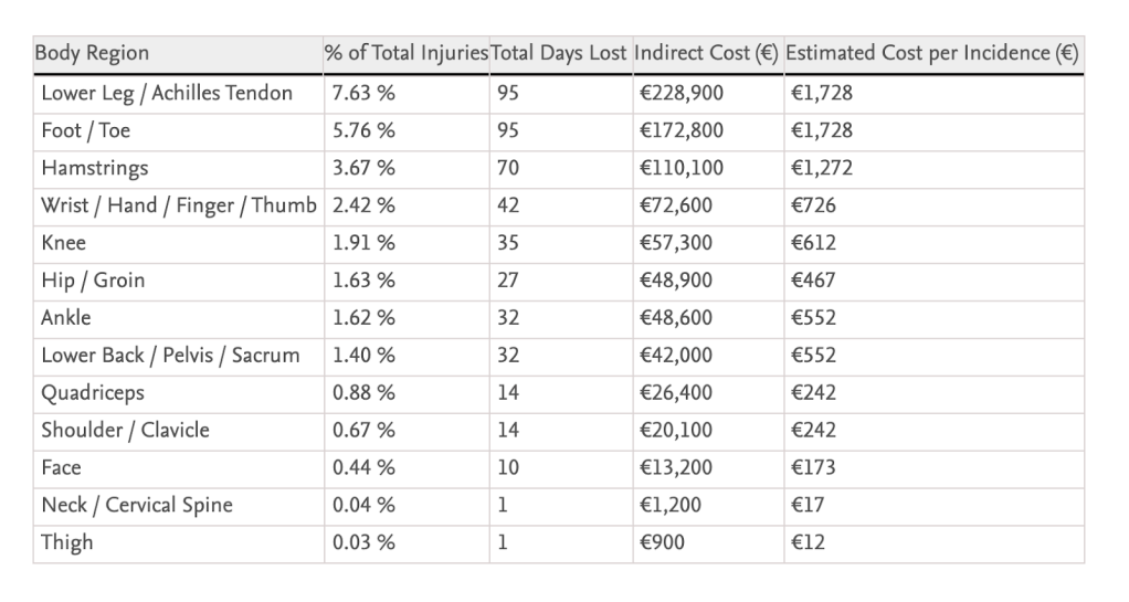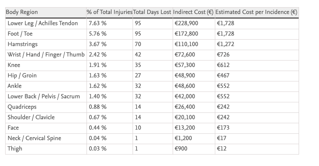 Figure 5: We can see the distribution of injury types by frequency, days lost, and indirect cost. Lower leg and foot/toe injuries are the most common and costly, each averaging over €1,700 per incident.