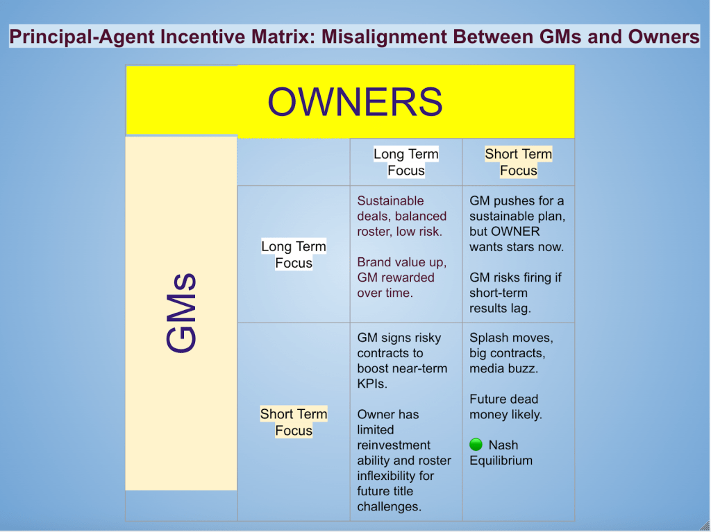 Figure 2: The vertical axis reflects the GM’s time horizon (long-term vs. short-term focus), while the horizontal axis reflects the owner’s investment horizon. When both focus long-term, optimization occurs. But when incentives diverge or both economic actors pursue short-term gains, financial inefficiencies emerge. The bottom-right cell reflects the common Nash equilibrium: stable, but suboptimal for long-run team value.